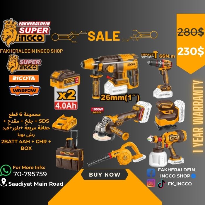 مجموعة 6 قطع SDS + جلخ + مقدح + حفافة مربعة +بلور+فرد رش بويا 2BATT 4AH + CHR + BOX